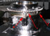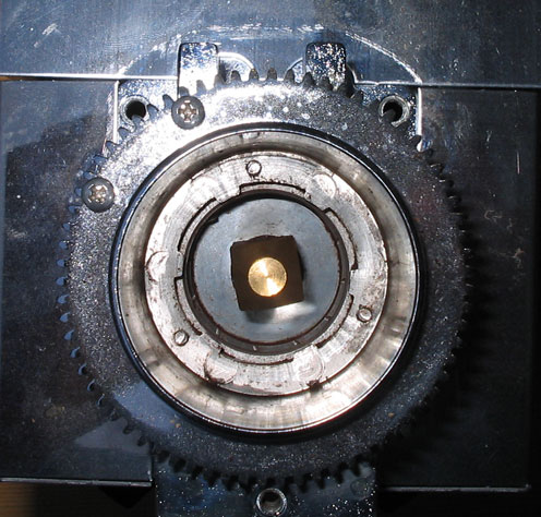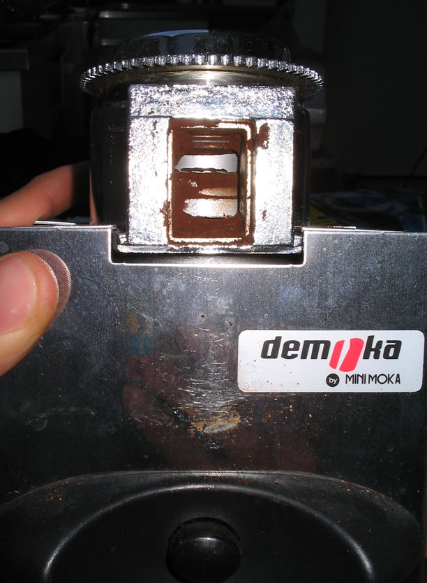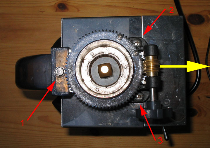 Um die obere Scheibe des Mahlwerks gegen den Uhrzeigersinn herausdrehen zu können, müssen die beiden Anschlagsschrauben 1 und 2 so weit heraus gedreht werden (müssen nicht ganz raus!), dass sie an Schraube 3 vorbei laufen.