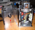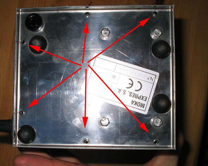 Möchte man das Gehäuse öffnen, so müssen die 6 rot markierten Schrauben in der Bodenplatte entfernt werden. Das ganze sollte dann etwa so wie in der rechten Abbildung aussehen (naja, bei mir hat der Taster an der Front keine Funktion :-)). Zusammenbau logischerweise in der umgekehrten Reihenfolge.