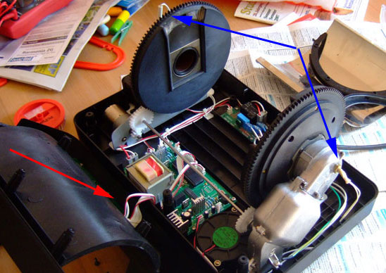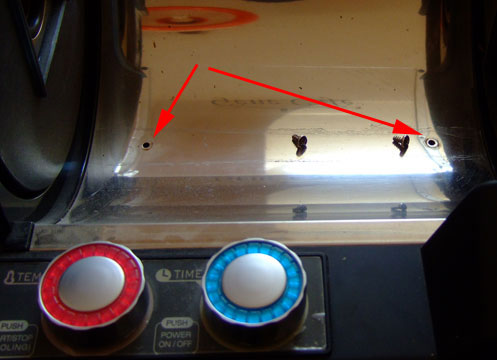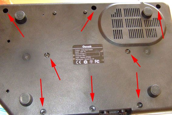 Im nächsten Schritt entfernt man die 8 Schrauben im Gehäuseboden, um dann das Oberteil des Rösters vorsichtig (!) zu entfernen. Zu beachten ist, dass Ober- und Unterteil durch ein Kabel verbunden sind! Mit blau habe ich übrigens beide Temperaturfühler markiert.